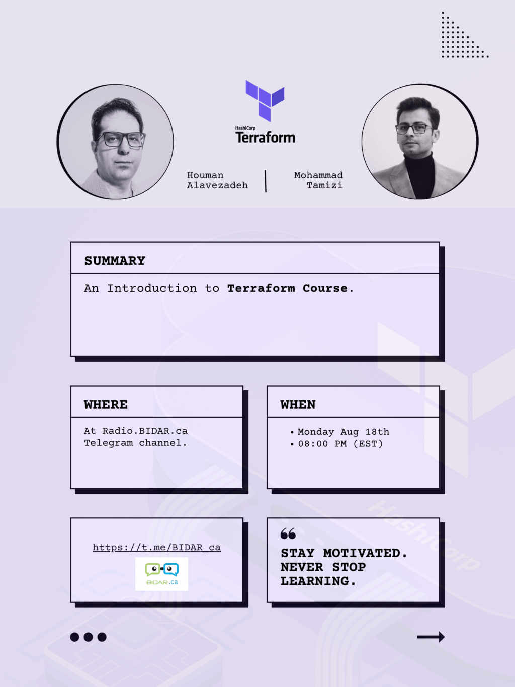 معرفی Terraform توسط هومن علاوهزاده و محمد تمیزی #Cloudforge 2025/08/18 T.me/BIDAR_ca