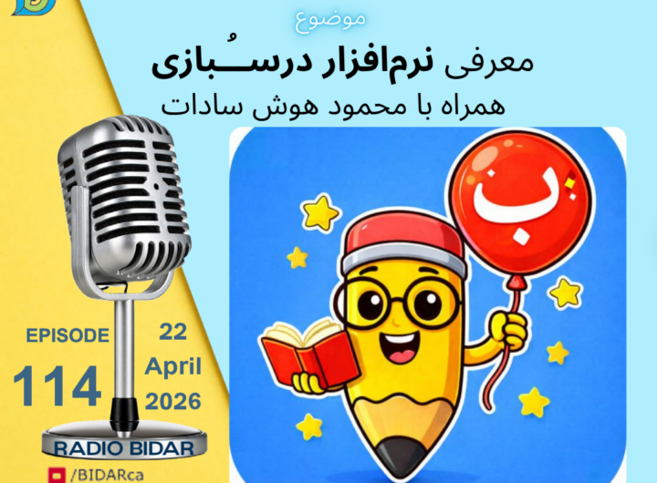 رویداد اطلاعیه ضبط پادکست شماره ۱۱۲ رادیو بیدار – از دنیای تکنولوژی چه خبر؟ Samira آوریل 14, 2026 اطلاعیه جلسه گفتگوی گروهی با موضوع: از دنیای جدید تکنولوژی چه خبر؟ دوشنبه ۱۳ اپریل ۲۰۲۶ ساعت ۲۱:۰۰ به وقت شرق کانادا در تلگرام توسط کانون برنامهنویسان ایرانی در کانادا Share: 18 Continue Reading Previous: اطلاعیه ضبط پادکست شماره ۱۱۱ رادیو بیدار – نحوه همکاری متخصصین در نوروز کلابNext: اطلاعیه ضبط جلسه آموزشی AWS (Amazon Web Services) دیدگاهتان را بنویسید لغو پاسخبرای نوشتن دیدگاه باید وارد بشوید. Related Stories اطلاعیه ضبط پادکست شماره ۱۱۳ رادیو بیدار – روز جهانی آزادی سختافزار رویداد اطلاعیه ضبط پادکست شماره ۱۱۳ رادیو بیدار – روز جهانی آزادی سختافزار Samira آوریل 18, 2026 اطلاعیه ضبط جلسه آموزشی AWS (Amazon Web Services) رویداد اطلاعیه ضبط جلسه آموزشی AWS (Amazon Web Services) Samira آوریل 15, 2026 اطلاعیه ضبط پادکست شماره ۱۱۱ رادیو بیدار – نحوه همکاری متخصصین در نوروز کلاب رویداد اطلاعیه ضبط پادکست شماره ۱۱۱ رادیو بیدار – نحوه همکاری متخصصین در نوروز کلاب bidar.ca آوریل 3, 2026 اطلاعیه ضبط پادکست شماره ۱۰۸ رادیو بیدار- نگاهی به روباتیک در کانادا رویداد اطلاعیه ضبط پادکست شماره ۱۰۸ رادیو بیدار- نگاهی به روباتیک در کانادا bidar.ca دسامبر 14, 2025 اطلاعیه ضبط پادکست شماره ۱۰۲ رادیو بیدار – مناظرهای با موضوع هوشمصنوعی از نگرانی تا نوآوری رویداد اطلاعیه ضبط پادکست شماره ۱۰۲ رادیو بیدار – مناظرهای با موضوع هوشمصنوعی از نگرانی تا نوآوری bidar.ca سپتامبر 12, 2025 اطلاعیه ضبط پادکست شماره ۹۹ رادیو بیدار رویداد اطلاعیه ضبط پادکست شماره ۹۹ رادیو بیدار bidar.ca جولای 12, 2025